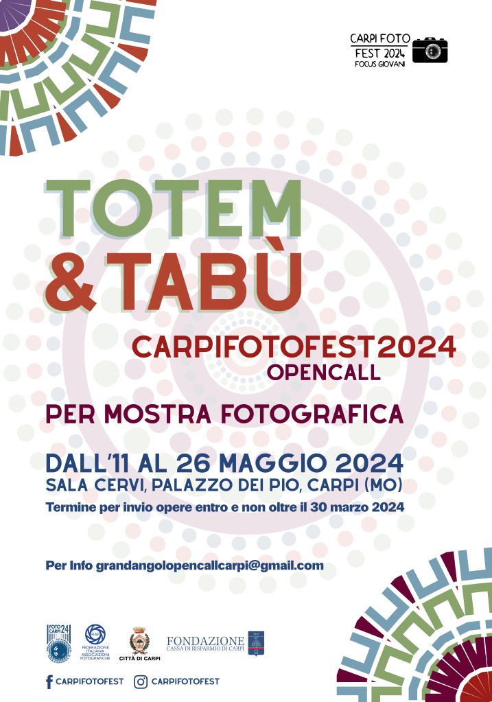 Il progetto espositivo per la 8° edizione di CARPI FOTO FEST 2024 FOCUS GIOVANI [TOTEM E TABÙ] si svolgerà a Carpi (MO) dal 11 al 26 maggio 2024, presso la SALA DEI CERVI, PALAZZO DEI PIO, CARPI (MO).